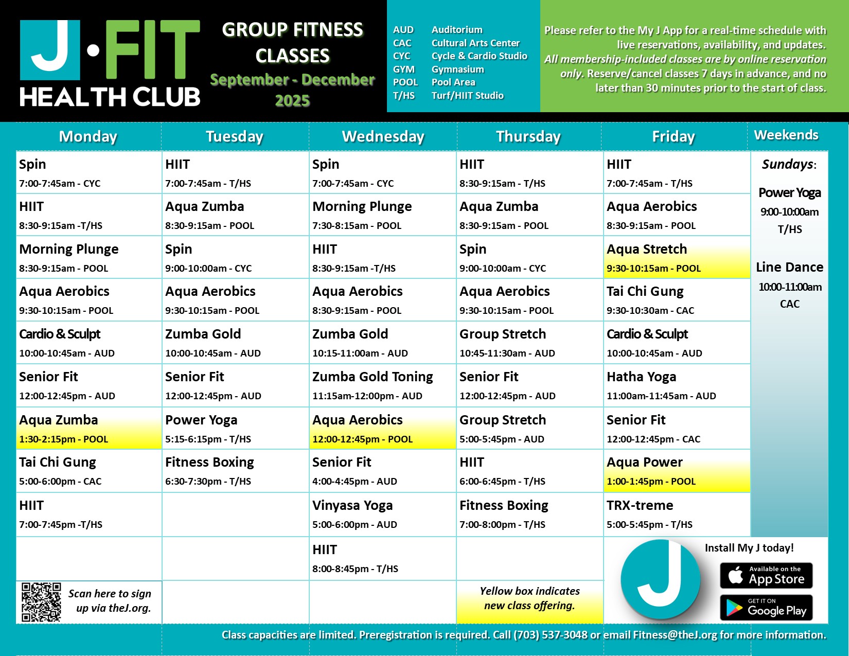 • Outdoor classes are weather dependent, and classes may be moved indoors or canceled due to weather or other emergencies. Please check the My J app or with guest services at the main entrance for information.
